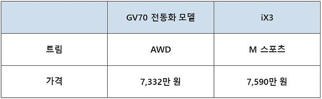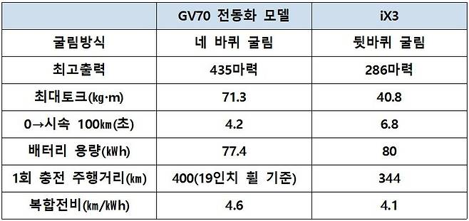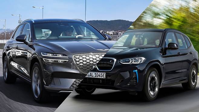 제네시스가 GV70 전동화 모델(이하 GV70)을 선보였다. 브랜드의 세 번째 순수 전기차로, 고급스러운 실내외 디자인과 승차감, 400㎞ 넘는 주행거리를 뽐낸다. 유력한 경쟁자는 지난해 말 출시한 BMW iX3. 두 차의 장단점을 살펴보기 위해 각종 스펙을 1:1로 비교했다.
