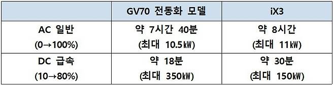 충전 속도는 어떨까? GV70는 350㎾ 초급속 충전을 지원한다. 덕분에 배터리를 10→80%까지 18분 만에 충전할 수 있다. 그러나 350㎾급 충전기를 갖춘 전기차 충전소는 아직 우리나라에 많지 않다. iX3는 150㎾ 급속 충전 시 80%까지 채우는 데 30분이 걸린다. 최대 완속 충전 용량은 GV70 10.5㎾, iX3 11㎾로 비슷하다. 완충 시간은 각각 7시간 40분, 8시간이다.