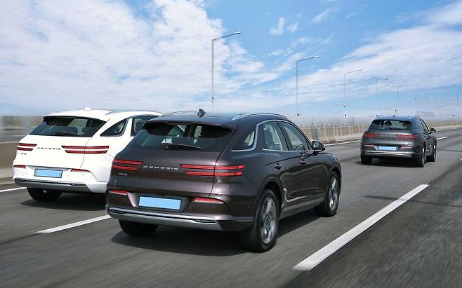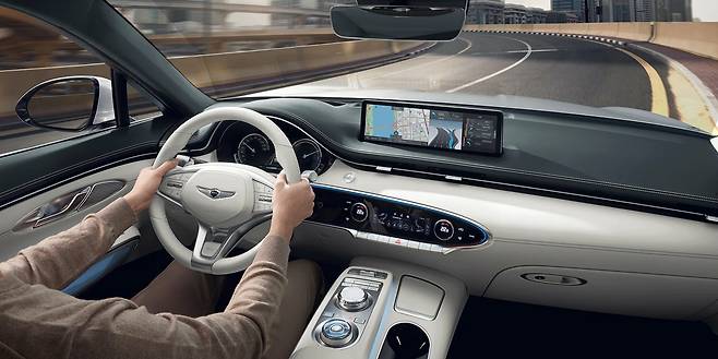 GV70는 앞뒤 차축에 전기 모터를 한 개씩 얹어 최고출력 435마력, 최대토크 71.3㎏·m를 낸다. 제원성능은 V6 3.5L 가솔린 터보 엔진(380마력, 54㎏·m)보다 넉넉하다. 최고속도는 시속 235㎞, 0→시속 100㎞ 가속 시간은 부스트 모드에서 4.2초다. 앞 차축에는 전기 모터와 구동축을 분리하거나 연결하는 ‘디스커넥터 구동 시스템(DAS, Disconnector Actuator System)’을 넣었다. 그 결과 주행 상황에 따라 뒷바퀴 굴림과 네 바퀴 굴림을 자유롭게 오간다.