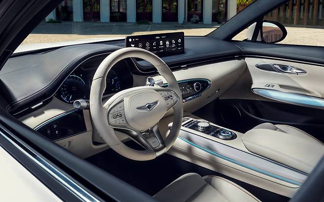 GV70의 인테리어는 여백의 미를 바탕으로 간결하게 꾸몄다. 여기에 전동화 모델 전용 ‘GUI(Graphical User Interface)’를 포함한 12.3인치 클러스터와 재활용 페트(PET) 원단으로 만든 천정 마감재, 울 원단을 함유한 천연 가죽시트로 친환경차 이미지를 강조했다. 또한, 2열 공간을 확보하기 위해 센터 터널을 낮추고, 차체 바닥 두께를 최소화했다.