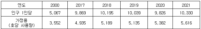 [표] 연도별 1인당 및 호당 전기 사용량 (단위; kWh)