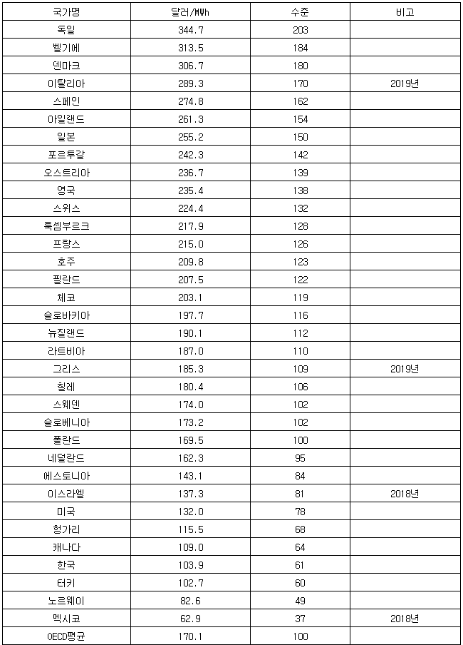 [표] 2020년 기준 OECD 회원국별 가정용 전기요금
