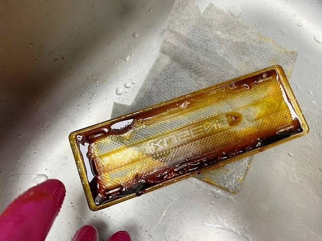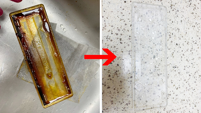 세척 후 기름때가 지워지지 않은 곳이 있다면 다시 봉지 안에 넣어 과탄산소다 물을 묻힌 뒤 주방 세제를 한 번 펌핑해서 문지르면 거의 다 지워진다. 이렇게 하면 기름때가 완벽하게 제거된다.
