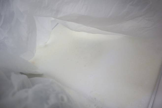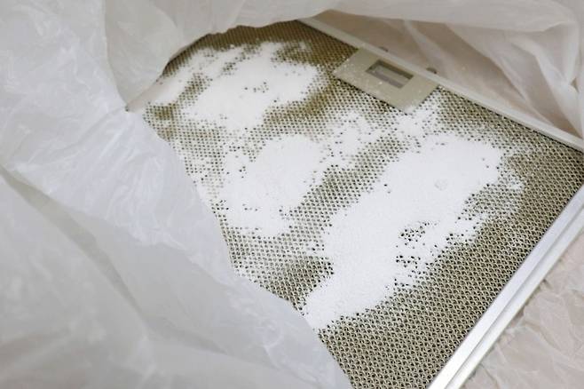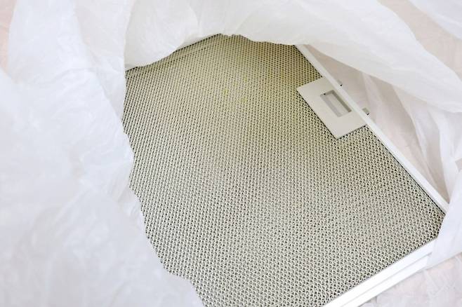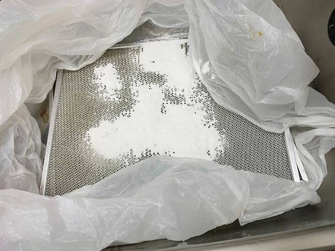 ② 큰 비닐봉지 안에 주방 후드를 넣고, 그 위에 과탄산소다를 종이컵 두 컵 정도 뿌린다.