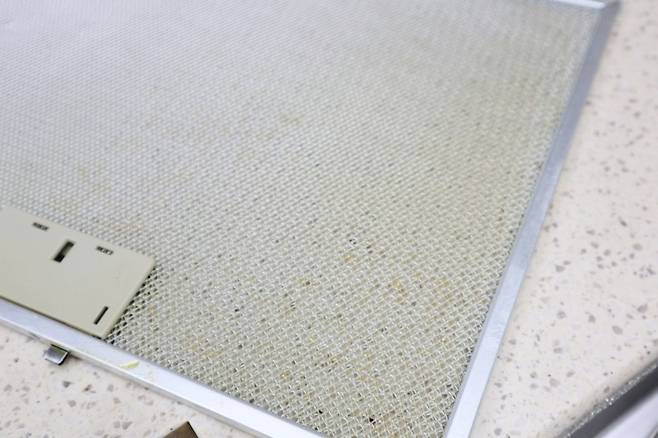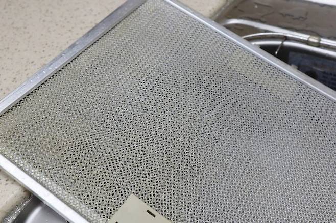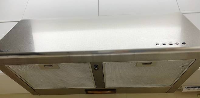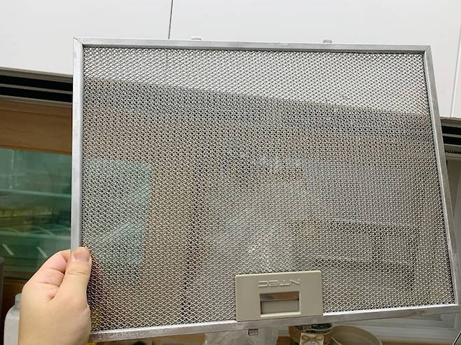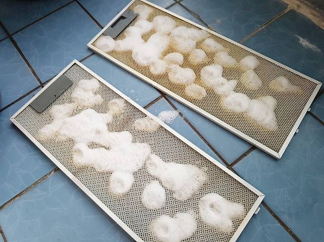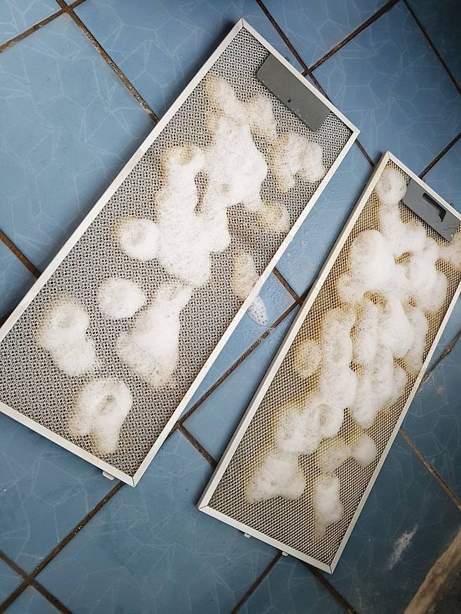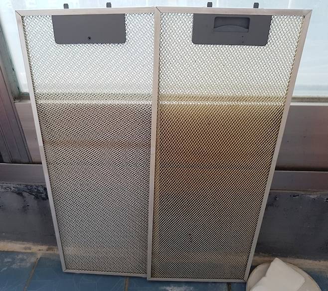 과탄산소다와 뜨거운 물, 주방 세제로 다시 태어난 주방 후드. 청소하고 나니 아주 개운하다.