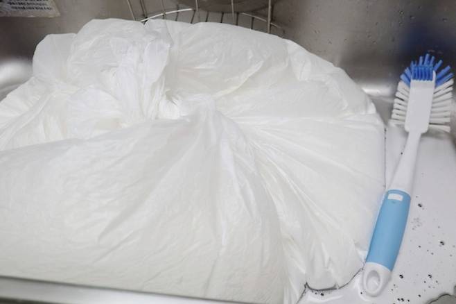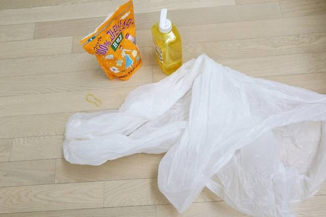큰 비닐봉지가 없으면 100L 쓰레기봉투를 사용해도 되고, 청소용 솔 대신 수세미를 사용해도 된다. (사용해 보니 수세미가 더 잘 지워지는 것 같다.)