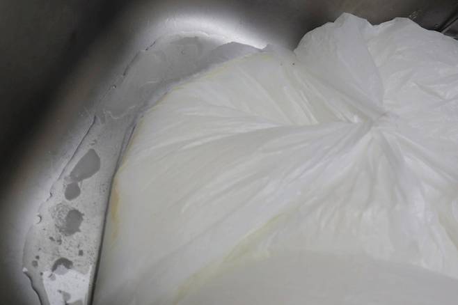 봉지 윗부분을 잡고 흔들기만 해도 누런 기름때가 보인다. 투명한 봉지를 사용했다면 때가 눈에 띄게 보였을 것 같다.