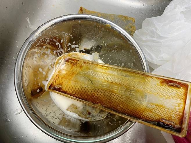 봉지에서 후드를 꺼내 솔이나 수세미로 문질러가며 남은 기름때를 제거한다. 그리고 뜨거운 물을 부으면서 헹궈준다.