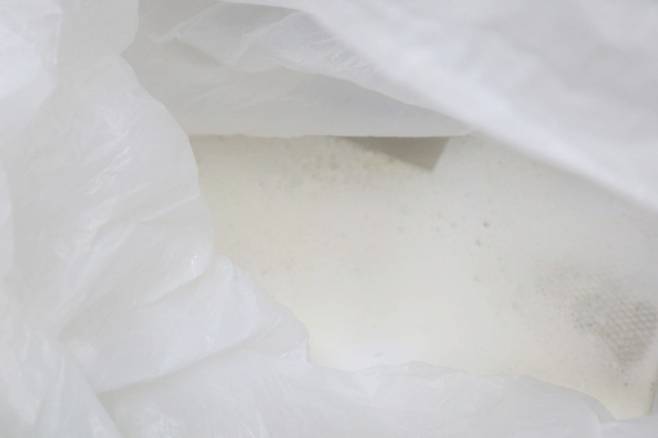 주방 세제를 넣은 후 봉지의 연기가 새어나가지 않도록 봉지를 잡는다. 그리고 봉지를 흔들어준다.
