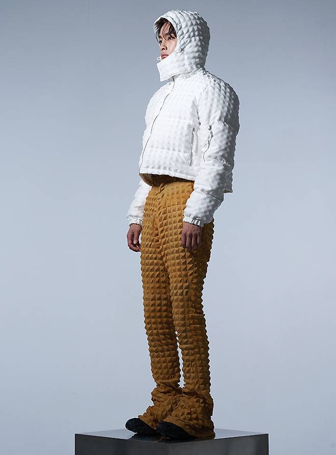 상락 이번 컬렉션은 이전 시즌과 마찬가지로 지속 가능성, 산업 소재와 자동차 산업에 대한 리서치에서 출발했다. 우리가 주목한 소재는 앞서 말한 자동차 내부의 흡음재. 지속적으로 다뤄온 에어백과 비건 레더를 비롯한 여러 지속 가능 소재에 양각 음각 효과를 적용시켰다. 이를 통해 우리가 그간 집중해온 인공적인 세계에 대한 영감을 한층 강화시킬 수 있었다.