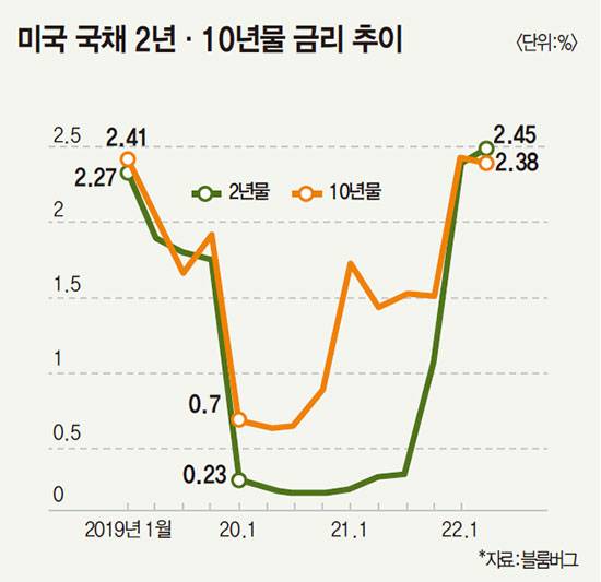 블룸버그통신에 따르면 지난 3월 29일(현지 시각) 오후 한때 뉴욕 채권 시장에서 국채 10년물과 2년물 금리가 둘 다 연 2.39%대에서 혼조세를 보이다 2년물 금리가 미세하게 더 높은 현상이 수초간 이어졌다. 2년물 금리가 10년물을 앞지른 건 미중 무역분쟁이 빚어졌던 2019년 9월 이후 처음이다. 통상 금융 시장에서 금리 역전 현상의 바로미터로 삼는 채권이 2년물과 10년물이다. 10년물은 글로벌 금융 시장에서 대표적인 시장 금리다. 2년물은 미 연준의 통화 정책에 민감한 특성을 보인다.