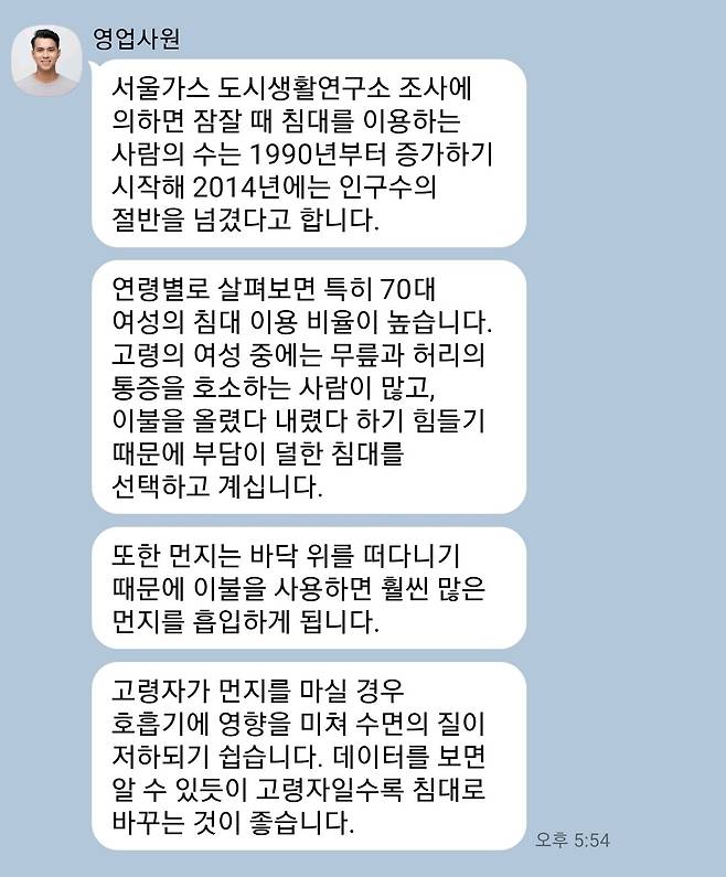 예를 들어 바닥에 이불을 펴고 자는 고령의 여성에게 침대 구매를 제안하는 경우, 다음처럼 객관적인 데이터를 제시해야 한다. 여기서 주의해야 할 점은 '나는 이렇게 생각한다'라는 주관적 의견을 배제해야 상대방을 설득할 수 있다.