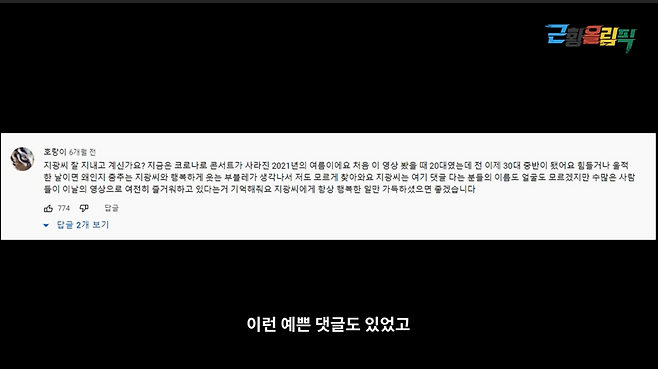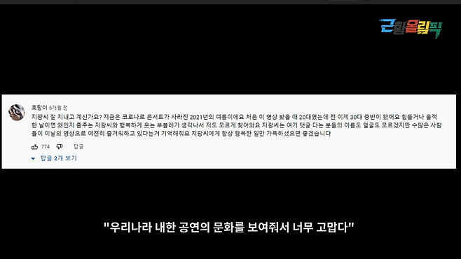 군대 선임도 나타나고 뭐 초등학교 친구들이 “쟤 원래 별명이 무슨 미지광이다” 이런 얘기를 하는데 그게 다 맞기는 맞거든요. “와 그래도 부블레한테 우리나라 내한 공연의 문화를 보여줘서 너무 고맙다” 이런 예쁜 댓글도 있었고.