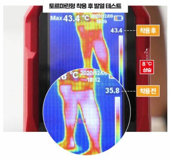제품 착용 후 약 20분 후 토르마린이 온열 작용을 일으켜 통증을 완화시켜주는데요. 토르마린에서 방사된 미약전류가 피부를 투과하면서 발생하는 열입니다. 발열 테스트 결과에 따르면 착용 전 35.8℃였던 무릎 주변의 온도가 착용 후 43.4℃까지 상승했습니다.