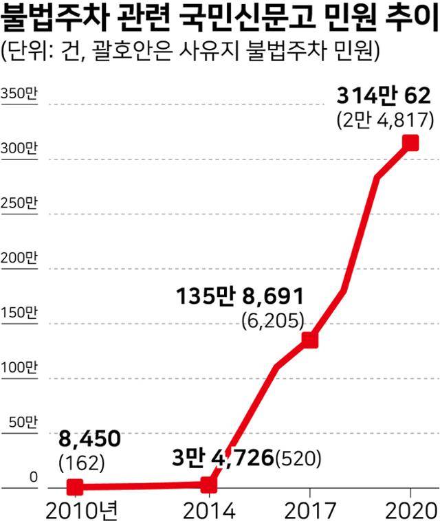 국민신문고에 접수된 불법 주차 갈등 민원은 2010년 8,450건에서 2020년 314만62건으로 10년 사이 370배 늘었다.