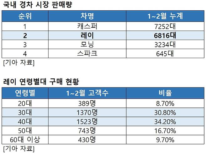 그러나 기아 레이는 2011년 첫 출시 이후 남녀노소 모두에게 꾸준히 사랑을 받고 있다. 실제 지난 1~2월 신규 등록된 레이는 6816대로, 7252대가 등록된 캐스퍼 뒤를 바짝 뒤쫓고 있다.