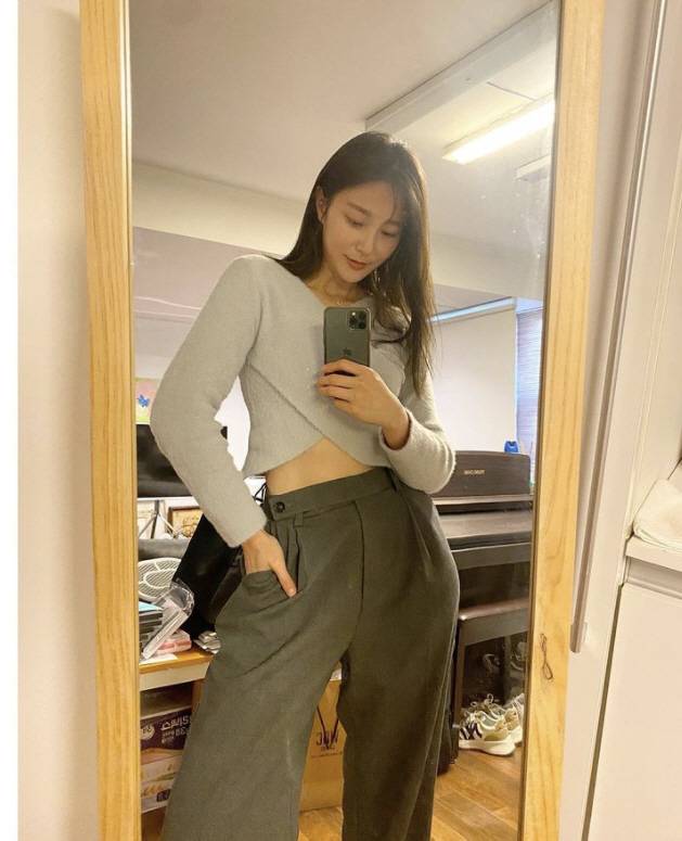안혜경은 배가 살짝 보이는 크롭 랩 니트에 팬츠로 한껏 멋을 낸 모습.