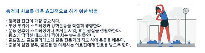 충격파 치료의 경우, 수술을 제외한 비수술적 치료법 중에서 상당히 좋은 치료법으로 인정되고 있다. 몸에 부상이 왔을 때, 꼭 골프를 잘 이해하는 전문의의 정확한 진료를 받은 후, 좋은 치료법으로 사용되길 바란다.
