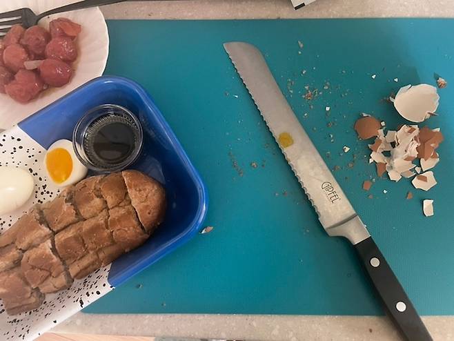 도마가 널찍하니 빵도 자르고, 달걀 껍질도 까고 쓱 털어버리고! 처음 샀을 때 앞 뒤 구분이 안돼서 찾아봤는데 오돌도톨한 면이 위로 향하게 쓰면 된다.