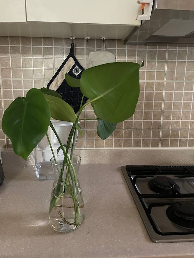유리병에 막 물꽂이한 잎들, 싱그러운 느낌! 곧 뿌리가 무성하게 자라겠지? ㅎㅎ