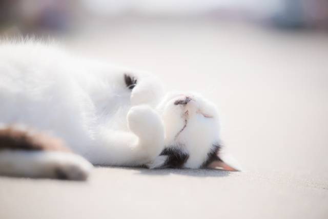 옆으로 누워 네 다리를 쭉 뻗고 잘 때도 고양이는 즉시 일어나 행동하기 어렵습니다. 즉, 이 자세도 집사를 좋아할 때 나오는 행동. 특히 네 발이 바닥에서 모두 떠 있어 육구까지 보인다면 매우 릴렉스한 상태라고 말할 수 있겠습니다.