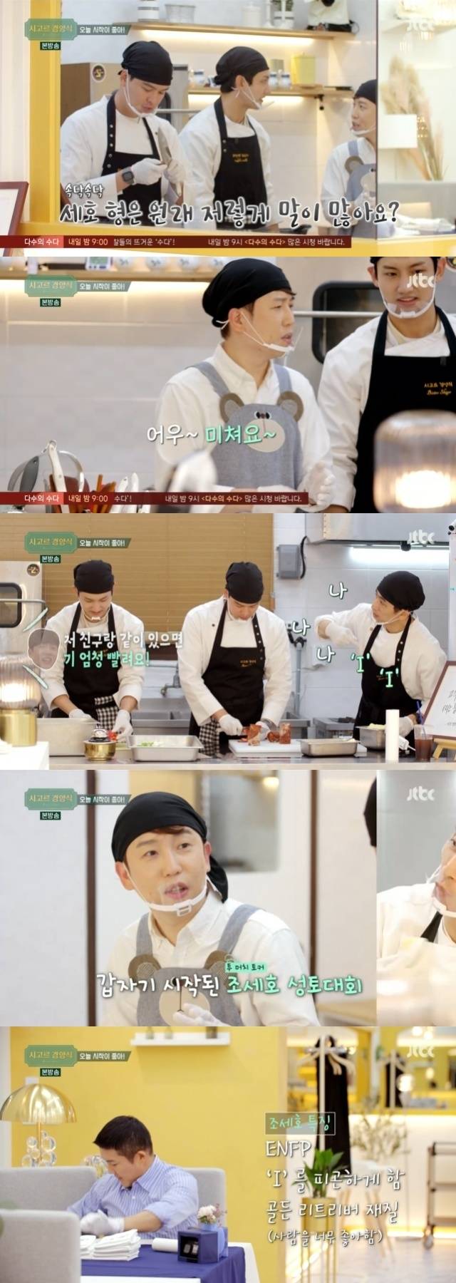 이후 재료 준비에 들어간 주방 4인방은 소소한 담소를 나눴다. 특히 최강창민은 남창희에게 "세호 형이 원래 말이 많냐"고 물었고, 남창희는 "미친다"며 "MBTI I 분들은 저 친구랑 있으면 기 엄청 빨린다. 처음엔 재밌다가 조금 있으면 힘들어지잖나"라고 답했다. 이수혁은 "세호 형 MBTI가 약간 골든 리트리버같은 거란다"고 듣던 중 말을 더했다. (사진=JTBC '시고르 경양식' 캡처)