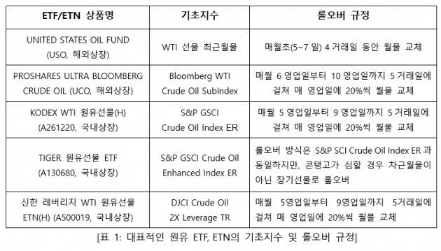해외에서도 원유투자 열기가 뜨겁기는 마찬가지였다. 가장 대표적인 원유 ETF인 United States Oil Fund(USO)의 시가총액은 2020년 초 1.4조원에서 4월말 4.9조원으로 증가하였다. 같은 기간 USO 가격이 102.48달러에서 18.86달러로 81.6% 폭락한 것을 감안하면 원유 ETN 매수세가 얼마나 대단했는지 알 수 있다. 주지할 점은 해당 ETF와 ETN는 모두 WTI 선물을 기초로 한다는 점이다. ETF와 ETN은 모두 기초지수를 추종하는 형태로 운용되는데, 아래 표와 같이 시가총액 규모가 큰 원유 ETF와 ETN의 기초자산은 모두 WTI 단기선물로 구성되어 있다.
