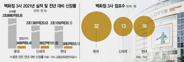 실제로 롯데백화점은 지난해 백화점 매출 1위 자리를 지켰지만, 신장률 면에선 신세계·현대와 비교해 크게 낮은 성적을 거뒀다. 백화점의 수익성 지표인 순매출을 들여다보면 롯데는 32개 점포에서 총 2조 8880억 원을 벌었다. 전년의 2조 6550억 원보다 8.8% 늘어난 수치다. 신세계와 현대의 작년 순매출은 각각 2조 1365억 원, 2조 1050억 원으로 모두 20%의 신장률을 보였다. 점포 수가 많아 절대적인 순매출 수치는 1등을 유지하고 있지만, 실적 반등 면에서는 오히려 그 규모가 발목을 잡았다. 투자가 30여 곳에 분산 되다 보니 전략적으로 더 많은 재원 투입이 필요한 백화점에 충분한 실탄이 돌아가지 못하고, 제대로 된 경쟁이 어려워지는 것이다.