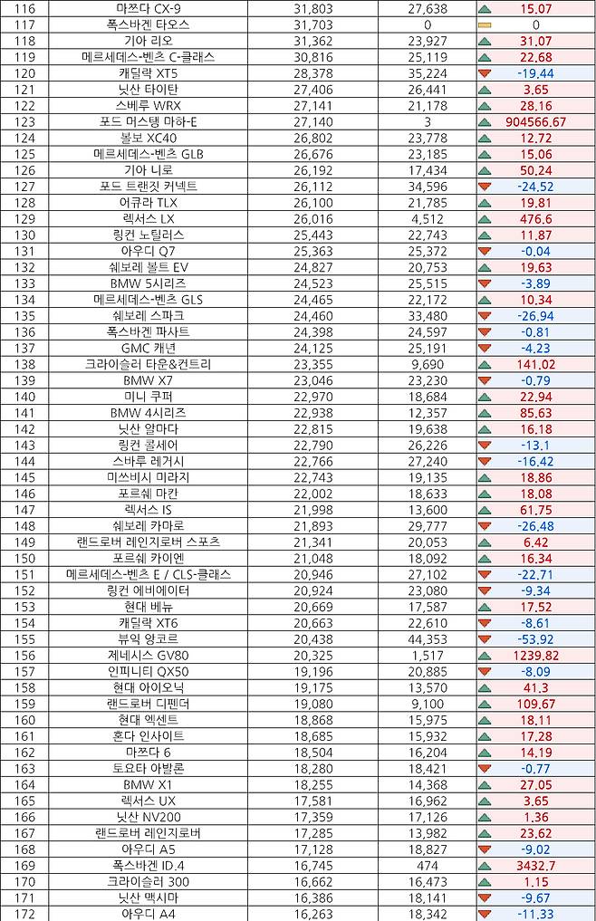 전체 판매량 리스트 중 전기차가 차지하는 비중이 많아졌다. 2020년 3대만 판매됐던 머스탱 마하-E가 2만 7천 대 이상 판매됐다. 폭스바겐 ID.4도 1만 6천 대 이상 판매됐다. 이외에 다양한 전기차들이 이름을 올리기 시작하며 새로운 시대를 반영하고 있다.
