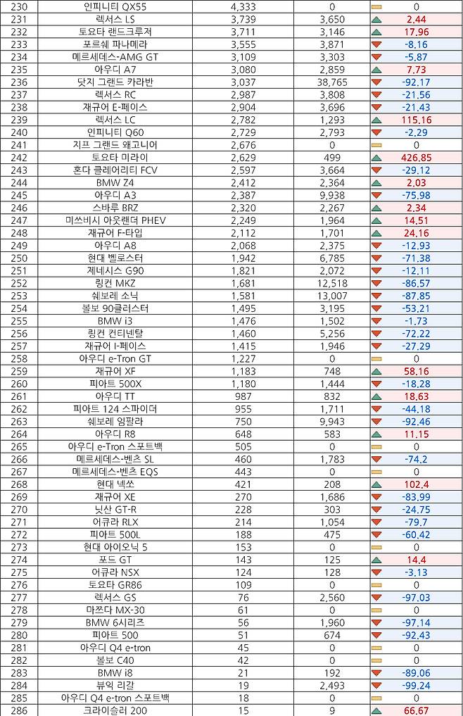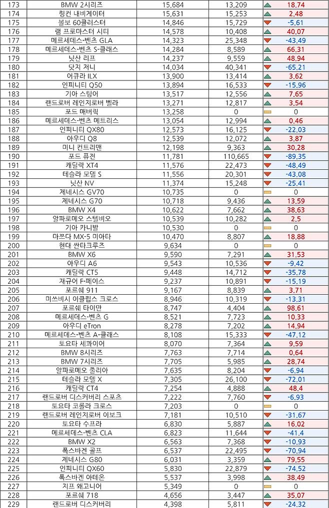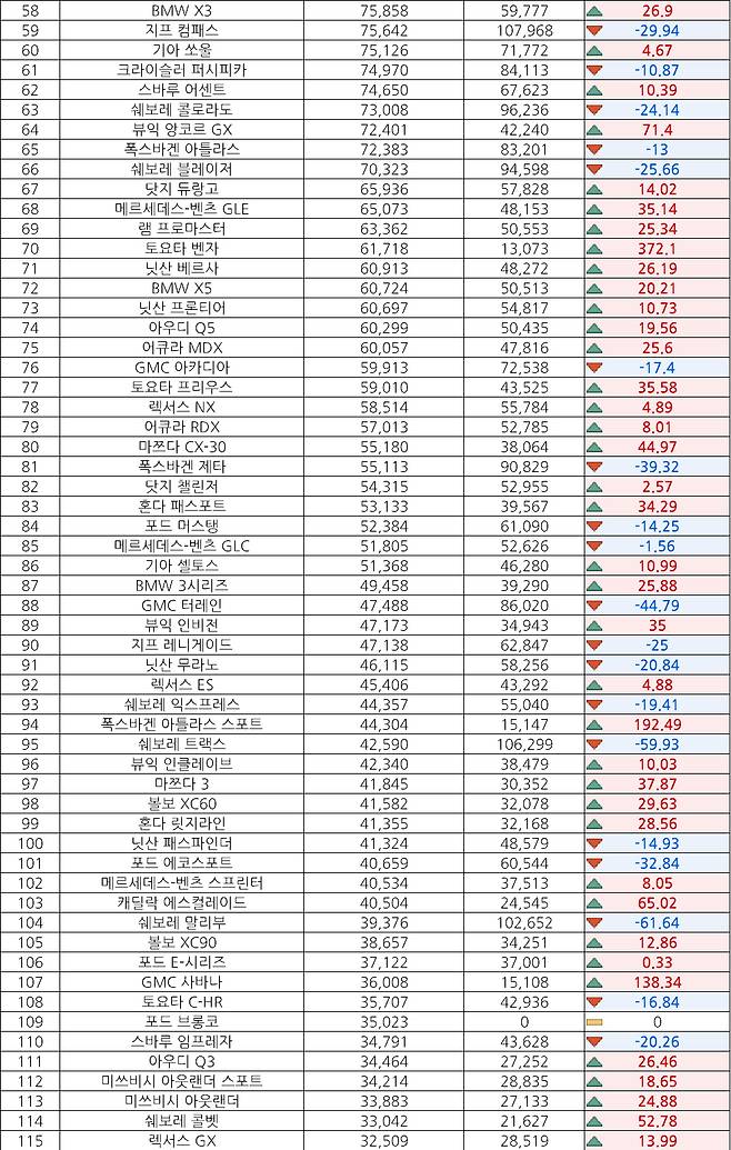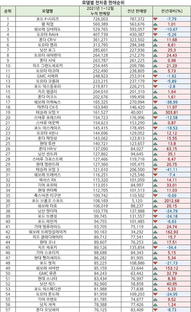 모델별 판매 순위는 포드 F-시리즈, 램 픽업, 쉐보레 실버라도 등 미국 픽업트럭이 1위부터 3위를 차지했다. 하지만 7%와 10% 이상 판매량이 하락해 예전 같은 절대적인 인기와는 거리가 멀어졌다.