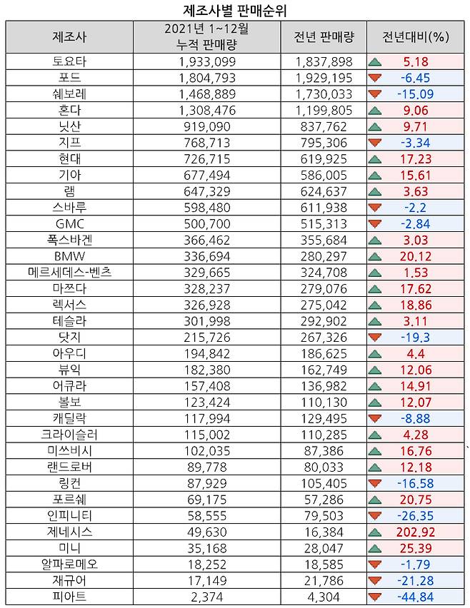 2021년 미국에서 가장 많은 판매량을 기록한 제조사는 토요타다. 월간 판매량으로 토요타가 포드를 넘어선 경우는 있었지만 연간 판매량으로 전체 1위를 기록한 것은 이번이 처음이다. 토요타는 지난해 약 193만 대를 미국에서 판매해 2020년 포드의 판매량을 넘어서는 저력을 보였다.