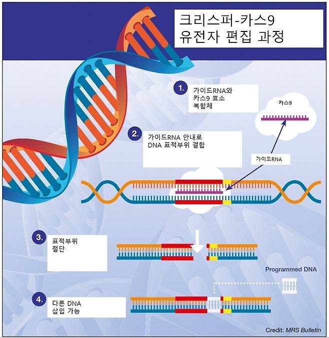분쟁의 씨앗은 10년 전에 뿌려졌다. 다우드나 교수는 노벨상 공동수상자인 엠마뉘엘 샤르팡티에(독일 막스플랑크연구소)와 함께 2012년 6월28일 ‘사이언스’에 ‘크리스퍼-카스9’이란 이름의 유전자가위 기술을 발표했다. 박테리아의 바이러스 면역 시스템에서 힌트를 얻은 이 기술은 유전자가위를 DNA의 표적 부위로 데려다 주는 가이드RNA(크리스퍼)와 표적을 잘라내는 효소 단백질(카스9)으로 구성돼 있다. 따라서 이 도구를 이용하면 유전체에서 원하는 부위만 골라 절단할 수 있다.