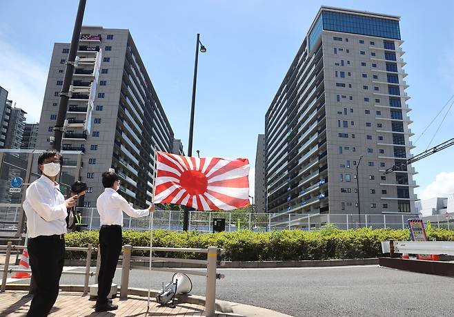 | ▲ 한국선수단 숙소 앞 '욱일기' 시위 지난해 7월 16일 오후 도쿄 하루미 지역 올림픽선수촌의 한국선수단 숙소동 앞에서 일본 극우단체 관계자가 응원 현수막 문구를 문제 삼으며 욱일기를 든 채 시위를 하고 있다. 대한체육회는 숙소 외벽에 태극기와 함께 '신에게는 아직 5천만 국민들의 응원과 지지가 남아 있사옵니다'라고 적힌 문구를 내걸었다. |