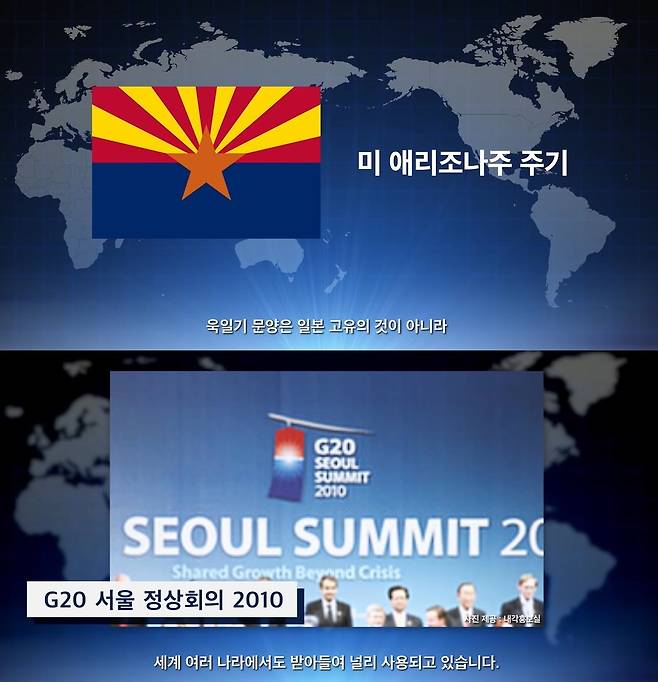 | ▲ 일본 외무성은 ‘일본의 오랜 문화로서의 욱일기’(한국어판)란 제목의 2분짜리 영상에서 “욱일기 문양은 일본 고유의 것이 아니라 세계 여러 나라에서 받아들여 널리 사용하고 있다”면서, 북마케도니아공화국 국기, 미국 애리조나주 주기, 베네수엘라 라라주 주기 등과 함께 지난 2010년 G20 서울 정상회의와 2011년 G20 칸 정상회의 심벌을 사례로 들었다 |