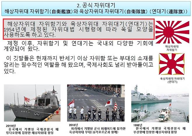 일본 외무성은 지난 2월 홈페이지 설명자료에서도 1800년대 중반부터 욱일기를 풍어기원기 등으로 일상적으로 써왔고, 1954년부터 자위대 연대기와 군함기로 사용하면서 국제 사회도 널리 받아들이고 있다고 주장했다.