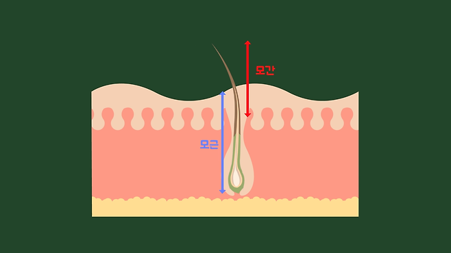 모근(Hair root)은 피부 속에 있는 모발이고, 피부 밖으로 나온 모발은 모간(Hair shaft)이라고 합니다. 모낭은 모근을 전체적으로 감싸주어 보호하는 역할을 합니다. 그리고 모낭 아랫부분이 모구부를 감싸고 있고, 모구의 바깥쪽으로 모유두가 존재합니다.