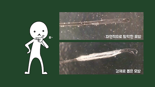 근데 모발이 완전히 각화해서 탈락하기 이전에 인위적으로 머리카락을 뽑으면 어떻게 될까요? 성장 중인 상태에서 그대로 뽑힙니다. 즉, 투명한 물질의 정체는 내모근초·외모근초의 일부이고, 아직 비듬으로 없어지기 전이었으므로 모발이 생장 중이었다는 의미입니다.