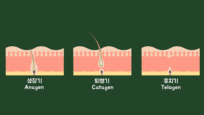 모발은 생장기와 퇴행기, 휴지기의 3단계 주기를 갖습니다. 생장기에서는 모근에 있는 세포가 활발히 분열하면서 모발이 자라고, 퇴행기에서는 모근이 표피 근처로 점점 올라옵니다.