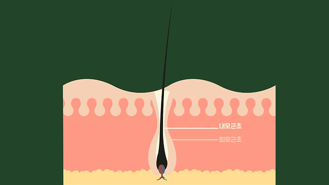 여기까지 명칭 구별을 해봤습니다. 더 나아가서 모낭의 일부인 내모근초(Inner root sheath)와 외모근초(Outer root sheath)에 관해서도 알아야 합니다. 모낭의 내측을 내모근초라고 하고, 외측을 외모근초라고 하는데, 모구부 근처에서 세포분열로 만들어져서 모발이 생장할 때 함께 올라갑니다.