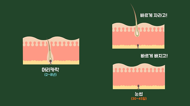 모발의 발생 과정을 간략히 알아봤는데, 많이 왔던 질문 중의 하나가 눈썹은 왜 자라지 않느냐는 겁니다. 이에 대한 답변을 해보면 눈썹 모발의 생장기가 짧아서 그렇습니다.