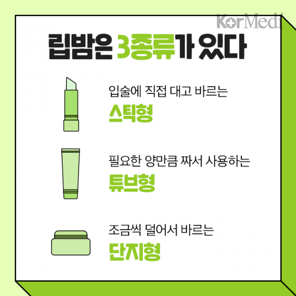 시중에 판매되는 립밤은 3종류가 있다. 입술에 직접 대고 바르는 스틱형과 필요한 양만큼 짜서 사용하는 튜브형, 조금씩 덜어서 바르는 단지형이다.