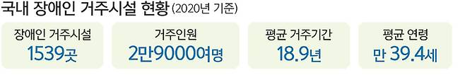 13일 보건복지부에 따르면 2020년 기준 전국 1539개 장애인 거주시설에 2만9000여명이 거주하고 있다. 이들의 평균 거주 기간은 18.9년이다. 복지부가 의사소통이 가능한 시설 거주 장애인 6035명을 대상으로 탈시설 욕구를 조사한 결과, 33.5%는 탈시설을 희망했고 59.2%는 시설에 머물고 싶다고 답했다.