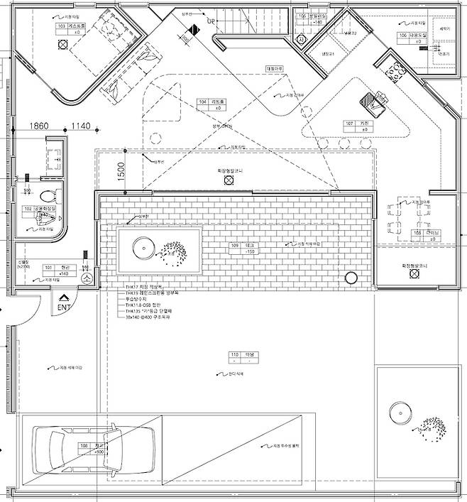 1층 전체에 대한 도면입니다. ㄷ자로 된 남향집에 마당에는 석재데크, 잔디밭, 조경 그리고 주차장이 있습니다. 주차는 규정상 2대가 들어가야 해요. 이렇게 특이하고 특별한 도면 보셨나요? 집에 세모, 세모, 세모, 곡선, 곡선, 곡선. 집을 짓기 전에는 가구 배치를 어떻게 해야 할지, 데드 스페이스가 많이 생길까봐 걱정했는데... 정말 쓸 데 없는 걱정이었습니다. 현관을 지나면 욕실, 파우더룸, 게스트룸, 거실, 주방 그리고 다이닝룸이 있습니다.