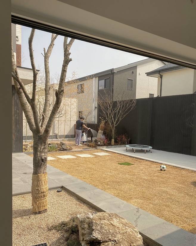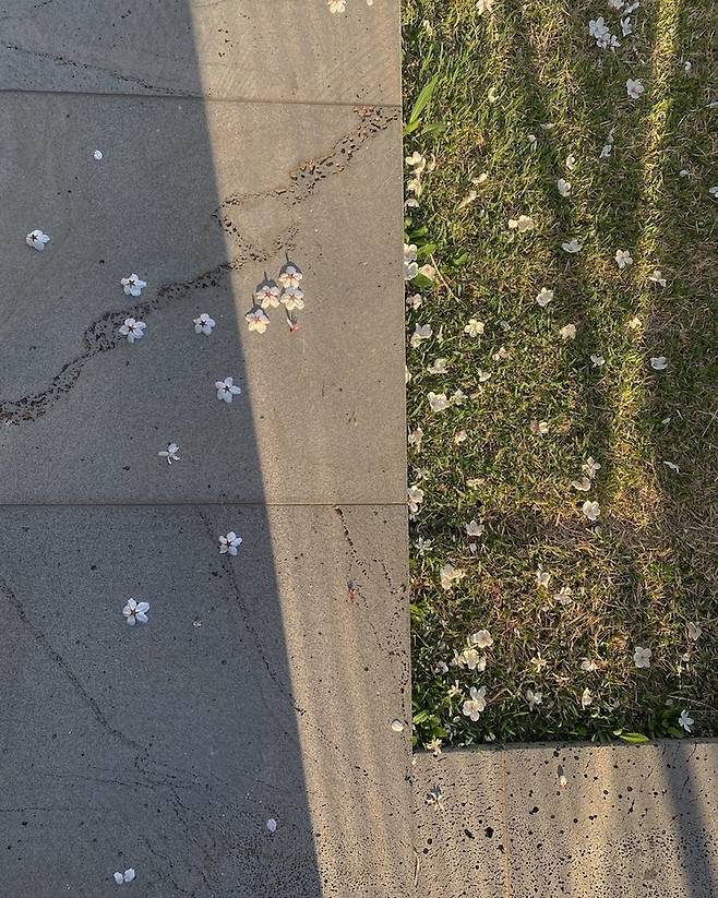 벚꽃이 떨어진 석재 데크와 잔디 그리고 빛의 조화가 마음을 말랑말랑하게 해주어서 좋아요. 전 성격이 급하고 하고싶은 것도 많아 늘 정신없고 바쁜데 다른 한 켠에는 느린 것, 멍 때리는 것, 그냥 내려놓고 아무것도 하지 않는 것을 제일 좋아하는 그런 이상한 성향을 지닌 소유자이지요. 저희 집이 그걸 보여주는 것 같아요. 워킹맘으로 찌든 사회 생활과 일상을 고요하고 차분한 집으로 보상받고 싶어요. 집의 분위기는 딱 그걸 표현하는 것 같고요.