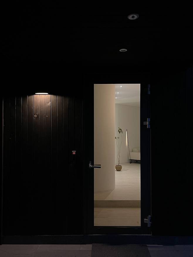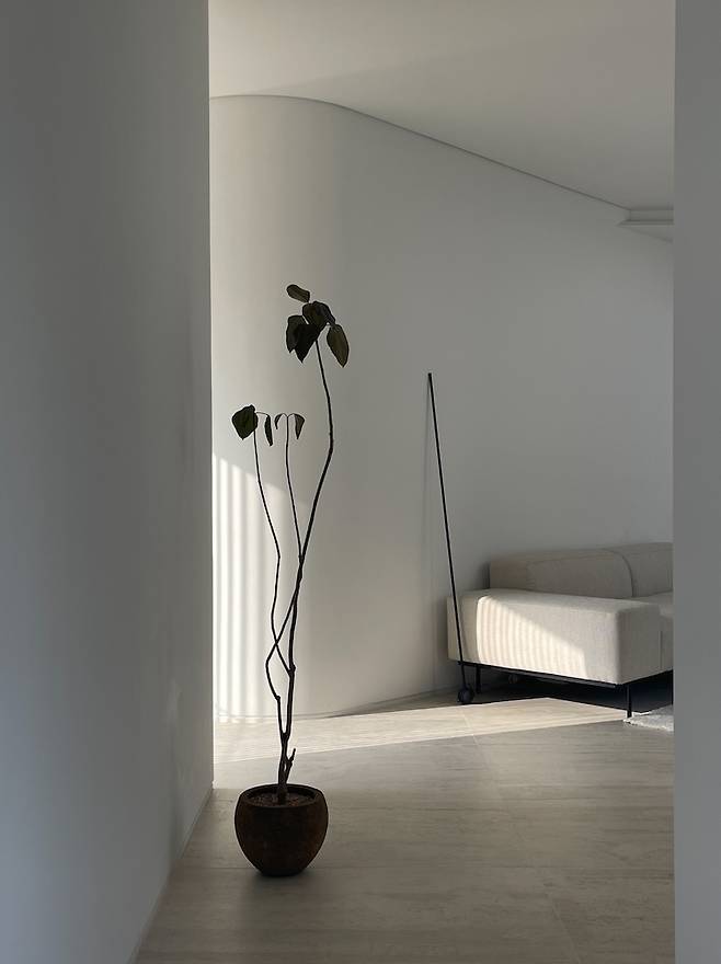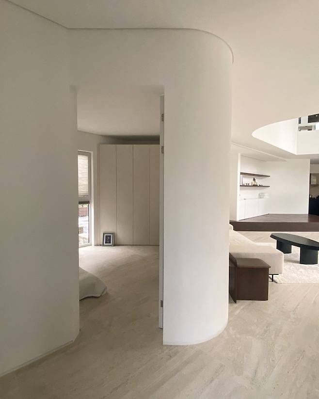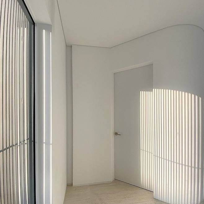 현관문을 열고 들어서면 보이는 뷰가 딱 여기입니다. 작은 현관과 좁은 복도가 라운드 처리된 벽과 픽스창으로 넓어 보여요.