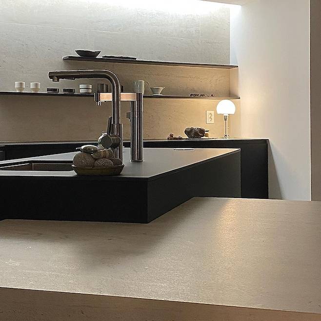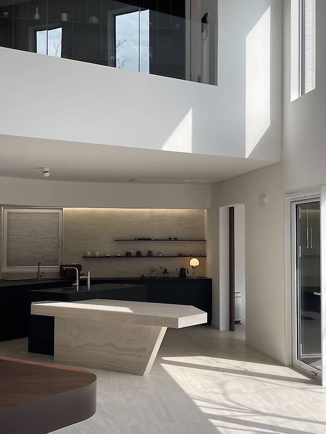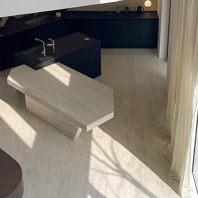여기서부터는 주방입니다. 거실과 바로 연결되어 있어요. 아일랜드와 연결되어 있는 수전은 건축가님께서 요리하면서도 거실 밖 정원을 볼 수 있게 앵글을 줘서 설계해 주신거에요. 제 마음을 읽어 주셨습니다. 조형물 혹은 예술작품 같은 아일랜드도 건축가님께서 직접 디자인해주셨습니다. 원래는 세모 모양이었는데 트라버틴 석재와 찰떡 같이 어울리는 기하학적인 모양으로 디자인해주셨어요. 여기는 저희 가족의 메인 식탁입니다. 바닥에서 쑥 뽑아 올린 것 같은 소재로 바닥과 아일랜드를 제작하였어요. 아... 건축가님 천재인가봐요. 블랙싱크대가 무게있게 밝은 베이지톤의 면적 즉 비율을 맞춰줍니다.
