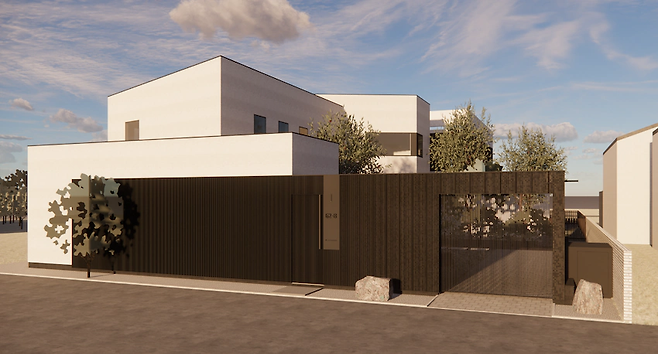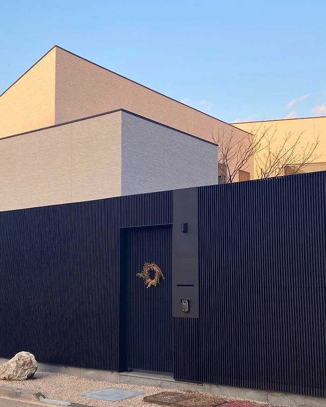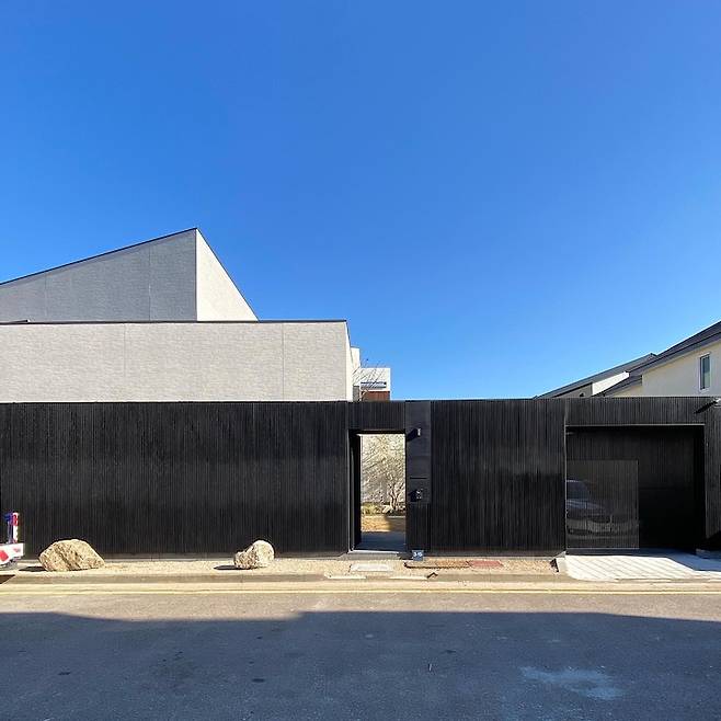 저희집 땅은 북쪽 서쪽 남쪽 사방에 집이 있고 서쪽만 트인 낀 집이라 집의 정면을 보여주기 어려워서 대문에 힘을 줬어요. 스테인레스 스틸 루버를 어둡게 코팅해서 대문과 주차장만 투과되어요.
