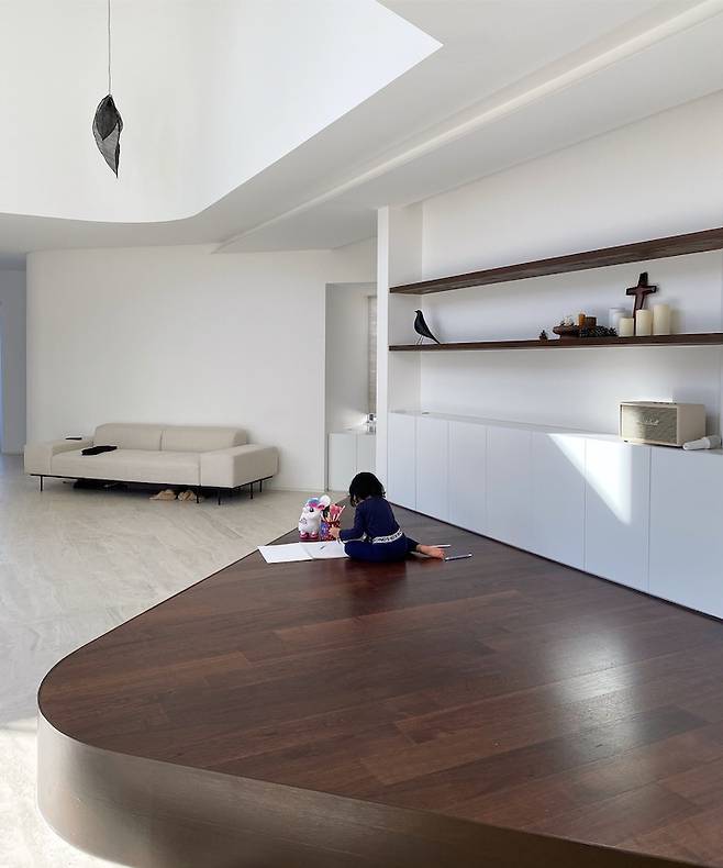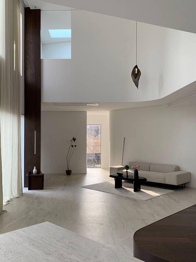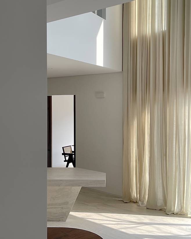 여기서부터는 거실이에요. 현관으로 들어와서 왼쪽으로는 파우더룸과 욕실, 오른쪽으로는 게스트룸이 있고 그 앞으로 거실과 주방이 연결되어 있습니다. 보이드 공간으로 일층부터 이층까지 천고가 뚫려 있어서 개방감이 상당합니다. 약 7미터의 높이입니다. 일층부터 이층까지 연결되는 짙은 월넛 파티션 너머로는 티비가 있어요. 커튼도 약 7미터 되는 아주 긴 린넨코튼을 설치했어요. 소파 자리를 지나면 거실 중앙에는 대청마루가 있습니다. 한 장의 사진에 많은 곡선들이 보이시나요? 곡선 처리한 벽들이 집을 웅장하고 부드럽게 보이게 해줘요. 시공은 어렵지만 정말 강력히 추천드립니다.
