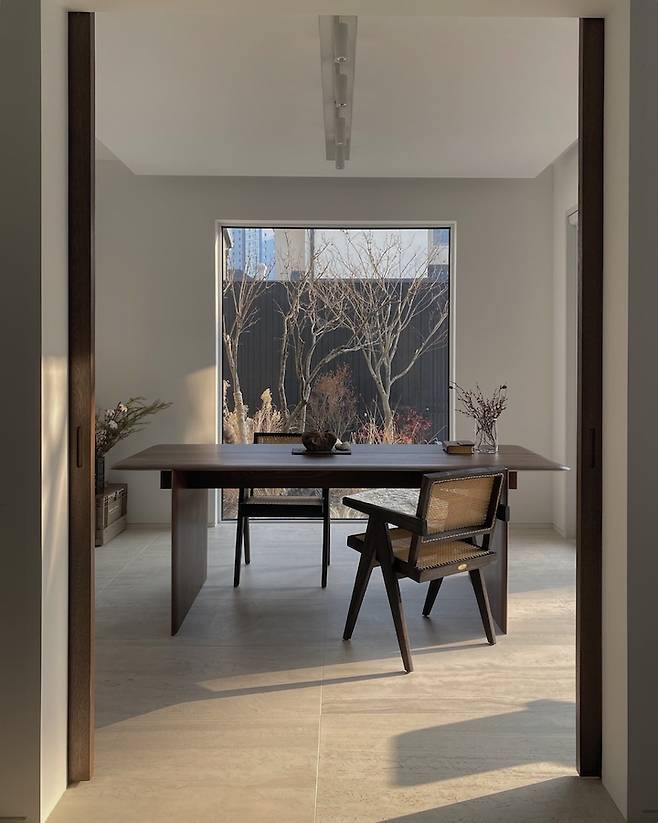 정원에서 보이는 다이닝룸 혹은 다이닝룸에서 보이는 정원은 제가 집에서 가장 애정하는 공간입니다. 갤러리창의 정석을 보여주는 듯하죠. 라일락 나무가 너무 멋스럽게 창 밖으로 보여요.