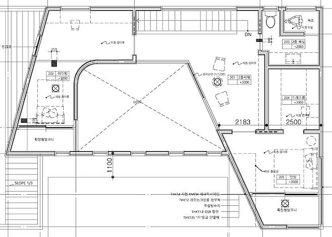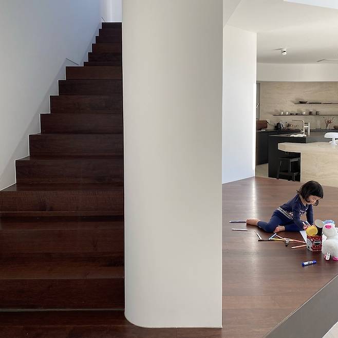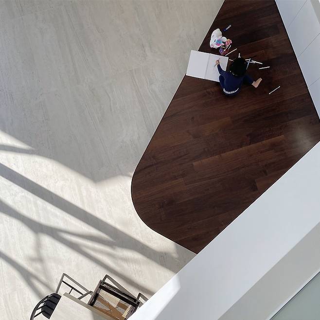 일층 투어가 끝나고 이층으로 올라가 보시죠. 집 구조가 특이해서 무릎을 탁 칠 만큼은 구조가 이해가 안되시죠? 설계도를 보고 참고해 주세요. 이층을 올라가는 벽도 역시 아름답게 곡선처리가 되어 있습니다. 이쯤되면 곡선 중독자입니다. 일층의 대청마루와 이층을 올라가는 바닥 소재와 색을 통일하였습니다.